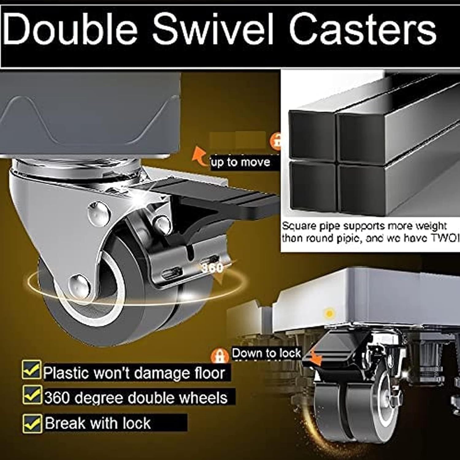 Simple assembly—connect the tubes, adjust the size, and lock in place. The 4 heavy-duty 360° swivel casters with locks allow smooth mobility and secure placement. -